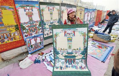 ????好不容易擠進李村大集,七八百米長的李村河底一眼望去到處是黑壓壓的趕集市民,許多買到年貨的市民和送貨的商販只得把物品高高舉過頭頂,在人群中擠來擠去。炕頭上的短腿小桌、拂灰塵的雞毛撣子、草編的老式鍋蓋、火紅的對子、兔年的餑餑磕子……平時很少能見到的民俗年貨堆滿集市攤位。祖孫四代經營家傳喜蠟的黑大成告訴記者,為避開人流高峰,他凌晨5點就從家出門,將整箱的喜蠟早早搬到河底擺下攤位。“我家已在李村集上賣了100多年的喜蠟?!?0多歲的黑大成告訴記者,早些年的李村集都是清晨五六點鐘趕集,中午前后集市就開始散了,而現在的李村集延長為全天集市,攤位也比以前規范了許多。