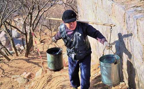 ????大約幾分鐘,尹老先生就把兩個水桶打滿了。他將一個木板蓋在了小水坑上后,挑起扁擔開始往家走。尹老先生雖然年紀大了,還挑著兩個滿滿的水桶,但走得很穩。