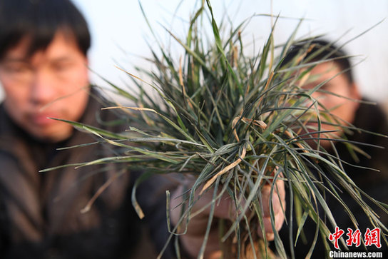 ????1月24日,在安徽省亳州市譙城區(qū)十八里鎮(zhèn)蔣窯村蔣窯莊麥田里,村民正在展示干枯的麥苗。當前,正值安徽省皖北小麥的越冬期,持續(xù)的無降水情況造成亳州市各地淺層土壤墑情較差,對冬小麥的生長不利。 劉勤利 攝 圖片來源:CNSPHOTO