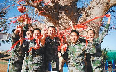 ????蘇丹達(dá)爾富爾聯(lián)合國(guó)超級(jí)營(yíng)地處于一片不毛之地,唯有中國(guó)營(yíng)區(qū)內(nèi)有兩棵參天的百年大樹,官兵們分別稱之為“常樂樹”和“常青樹”。春節(jié)來(lái)臨,中國(guó)第四批赴蘇丹達(dá)爾富爾維和大隊(duì)官兵按照慣例來(lái)到樹下,在晨風(fēng)中,系上了寄托子弟兵思念的紅綢帶(見上圖,本報(bào)記者吳文斌攝)。