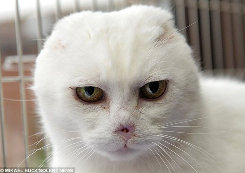 ????這只名為Charlie的貓咪因為得了皮膚癌而不得不接受手術(shù),切除了兩只耳朵和部分鼻子,它怪異的外表和詭譎的目光嚇退了不少寵物愛好者。