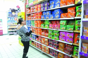 消費者在家樂福雙井店的康師傅方便面貨架前選購。 晨報記者肖丹/攝
