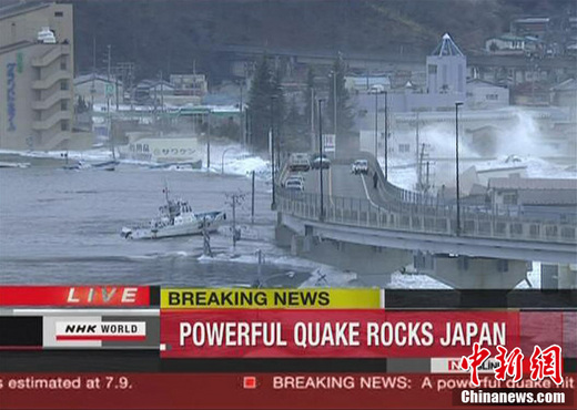 ????新華網(wǎng)東京3月11日電 日本氣象廳11日說(shuō),當(dāng)天發(fā)生的強(qiáng)烈地震已在日本東北太平洋沿岸引發(fā)巨大海嘯。電視畫(huà)面顯示,高達(dá)數(shù)米的海浪將車(chē)輛等卷入海中,并沖毀沿岸建筑。