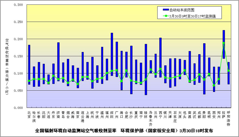 ????下圖是環境保護部(國家核安全局)3月30日18:00繼續發布的全國省會城市和部分地級市輻射環境自動監測站實時連續空氣吸收劑量率監測值。監測結果匯總圖中綠色曲線代表監測值,藍色柱體代表天然本底水平,綠色曲線均在藍色柱體范圍內。監測結果表明,目前我國環境輻射水平仍在本底范圍內,日本核電事故未對我國環境及境內公眾健康產生影響。