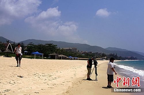 4月13日,隨同俄羅斯總統梅德韋杰夫到中國海南省三亞出席“金磚峰會”的俄羅斯記者在風景如畫的亞龍灣海濱拍攝外景。金磚國家領導人第三次會晤將于14日在這里舉行,中國國家主席胡錦濤與巴西、俄羅斯、印度以及南非的國家領導人將出席。中新社發任晨鳴 攝