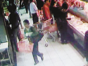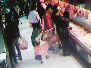 昨日下午,重慶晚報(bào)記者來到該超市,通過超市監(jiān)控錄像,看到了搶奪全過程:一名年逾五旬的盤發(fā)髻的婦女,手提購物籃,身穿深綠色V領(lǐng)針織衫,配一條黑色長(zhǎng)褲,胸前還有東西閃著銀光。