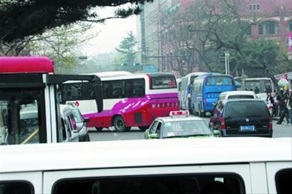 ????針對旅游大巴可能帶來的交通擁堵,昨天市南交警大隊采取了管控措施。 “我們今天沒處罰沒到停車場停放的大巴,從明天起,將對那些拒絕勸離的大巴貼單處罰。”(記者 楊海濤 通訊員 于昕 梁峰)