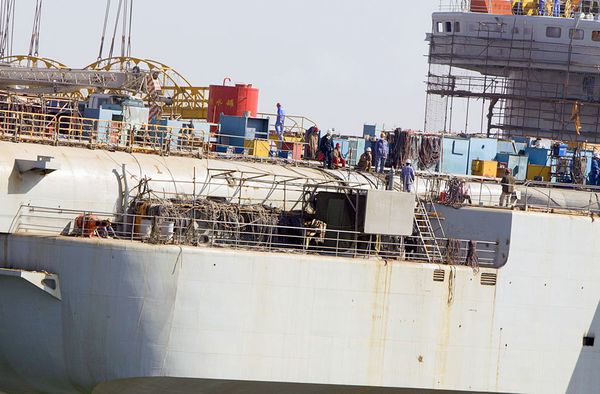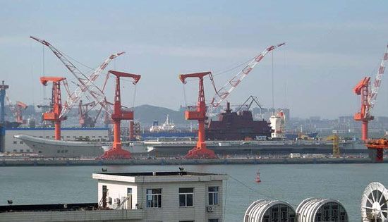 資料圖:一些網絡軍事論壇紛紛登載了在中國大連造船廠改建的“瓦良格”號航空母艦的照片。