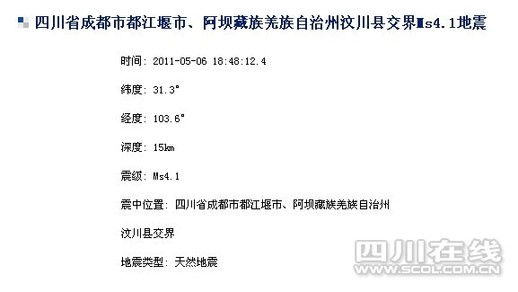????四川在線消息 根據中國地震臺網測定,今日18:48分四川都江堰市、汶川縣交界發聲4。1級地震,深度為15公里。成都震感明顯。