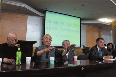 昨天,二戰(zhàn)中國(guó)勞工聯(lián)合會(huì)及三菱勞工分會(huì)與中、日兩國(guó)律師簽署“協(xié)定書(shū)”,勞工代表講述當(dāng)年經(jīng)歷。本報(bào)記者王海欣攝
