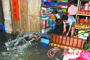 河源市區,雨水漫進店內,店主奮力“抗洪”。記者曾煥陽 攝