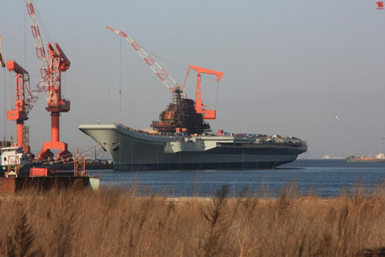 千龍網資料圖:正在大連進行消磁作業的“瓦良格”號航母。