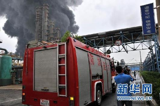 消防部門在現場救援(8月29日攝)。當日上午9時58分,中國石油大連石化公司發生火災。著火點系連接兩罐體之間管線爆裂引發。公安部已調集65臺消防車、組織296名消防官兵全力救援。目前,救援工作正在緊張進行中。新華社記者閆平攝