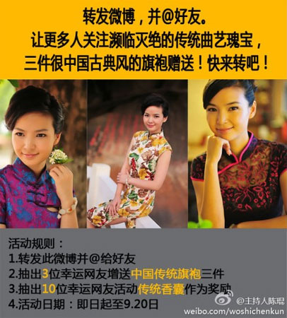 ????一則“拯救傳統曲藝”的微博,在短短兩天內引起近萬網友的支持。 ????9月13日,河南衛視《華豫之門》美女主持陳琨在個人微博上發起了#轉微博、救曲藝、送旗袍#活動。陳琨在微博上寫道:中國戲曲394個劇種現今僅存260余個,且很多遭遇傳承斷代、無人繼承的境地,曲藝之鄉河南,便有60余劇種瀕臨滅絕。你的一次轉發,便能喚起更多人對傳統曲藝的關注,呼吁拯救曲藝瑰寶,我將以大愛的三