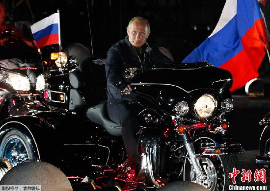 2011年8月29日,俄羅斯城市諾佛洛希克(Novorossiisk),俄羅斯總理普京騎著三輪哈雷機車率領摩托車隊前往黑海港口的一艘戰艦上參加紀念二戰勝利的活動。機車上的普京霸氣十足,頗有男子漢氣派。(資料圖)