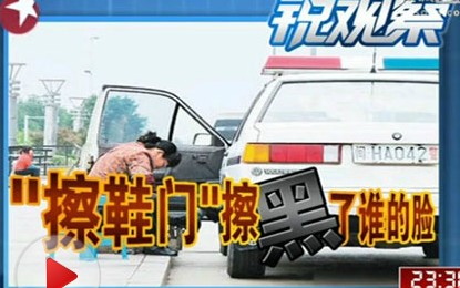 ????10日晚,網(wǎng)友發(fā)微博爆料,一輛警車停在浙江衢州市路邊,一只腳從警車伸出來,擦鞋婦女坐在車門口為其擦鞋。該微博被網(wǎng)友大量轉(zhuǎn)發(fā)。很多網(wǎng)友譴責(zé)這位警察像“大老爺”。