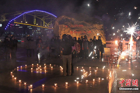 12月24日是西方傳統節日平安夜,在蘭州黃河岸邊,寒風刺骨,一男青年在朋友的幫助下向女友浪漫求婚,引得路人駐足圍觀。張道正 攝