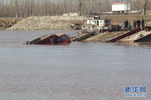1月3日4時(shí)左右,兩輛滿載石料的貨車通行濟(jì)南東郊黃河浮橋時(shí),原本行駛在后側(cè)的貨車在橋面上違章超車,兩車并行時(shí)浮橋板面不堪重負(fù)斷裂,兩車隨浮橋沉入黃河中。兩名司機(jī)在車輛下沉?xí)r成功逃生。目前,相關(guān)部門正采取措施加緊對(duì)貨車實(shí)施救援并修復(fù)浮橋。新華社發(fā)(呂傳泉攝)