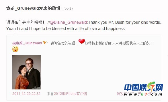 近日,突然閃電結婚的袁莉收到了來自美國前總統的祝賀,在微博上,袁莉高調感謝來自布什總統的祝賀。并表示期待穿上婚紗,舉辦婚禮的時刻。