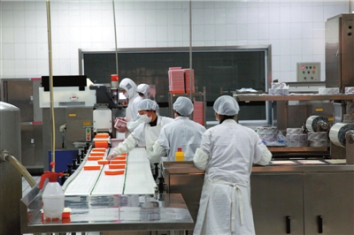 昨天,北京鐵路局動車段配餐中心內,米飯裝盒正在進行。(記者 王海欣 攝)