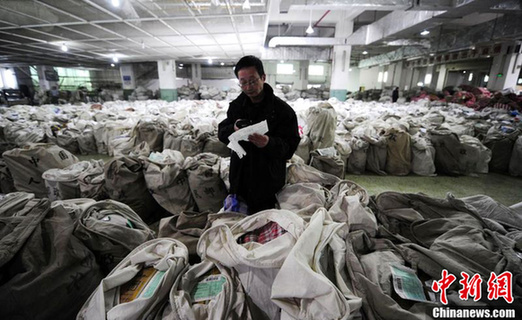 1月15日,重慶渝北區龍頭寺中國郵政快遞分揀處,春節臨近中國郵政快遞爆倉。春節臨近快遞業務量大幅度增加,倉庫里堆滿了等待分發的快遞物品。