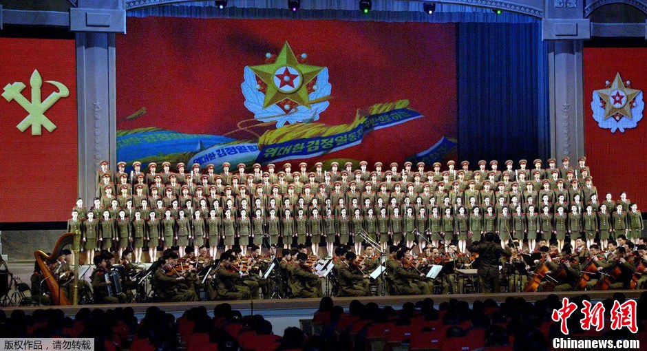 2012年1月18日,朝中社發布圖片,朝鮮人民軍隊的合唱團在1月17日進行表演,高唱“金正日同志是我們的最高領袖”歌曲,以紀念已故領導人金正日。