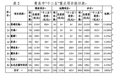 “十二五”期間重點項目統計表 ????記者從青島市發改委獲悉,青島市近日發布《青島市“十二五”重點項目建設規劃》(以下簡稱《規劃》),對五年內的重點項目進行規劃,實施現代服務業、先進制造業、基礎設施、交通、能源、現代農業、生態與循環經濟、社會民生八大領域900個重點項目建設,項目總投資9000億元,“十二五”期間完成投資6500億元,占“十二五”規模以上固定資產投資的30%左右。 ????在重點項目投資額中,基礎設施投資占15.08%,交通占14.38%,制造業占14.92%,服務業占29.54%,民生占16.23%,服務業項目占據比重最大。重點項目投資對經濟發展貢獻率由“十一五”期間的19%提高到23%,直接就業30萬人,間接就業60萬人,同時隨著半島藍色經濟區核心區和高端產業聚集區的建設全面展開,重點項目在保持經濟健康平穩發展的支撐和帶動作用進一步凸顯。 ????“十一五”重點項目建設回顧 ????“十一五”期間,青島市累計安排各類重點建設項目602個,涵蓋基礎設施、交通、能源、服務業、工業、農業、生態環保及循環經濟、社會民生等領域,項目總投資6143億元,實際完成投資4707億元。重點項目建設對經濟發展貢獻折算GDP為4134億元,占“十一五”期間GDP總量的19%;已完成項目直接帶動就業16萬余人,間接促進就業30萬人,占當期新增就業總人數的13%;增加利稅近180億元,對經濟和社會發展起到較好的支撐帶動作用。 ????重點項目環灣集聚 優化藍色經濟布局 ????《規劃》按照環灣高端集聚的思路,優化藍色經濟布局,推動資源整合和優化配置,環灣重點布局高端產業。環膠州灣區域,主要由膠州灣東海岸現代服務業核心區、北部高端產業集聚區和西海岸經濟新區三大板塊組成。東岸現代服務業核心區包括市南區、市北區、四方區、李滄區和嶗山區,重點布局旅游、會展、金融、文化意、科技與信息服創務、總部經濟等服務業重點項目,全面發展現代 務業,進一步提升城服市綜合功能。 ????北部高端產業集聚區包括高新區、城陽區、青島出口加工區、膠州市東部,重點布局半導體顯示照明、汽車機車、新材料、環保節能、生物醫藥、海洋科技等高端制造業和戰略性新興產業重點項目。高新區集聚政策和資源優勢,匯集國內外高端人才和創新要素,重點培育電子信息、生物與醫藥、高端裝備制造與節能環保、現代服務業等產業類項目。 ????西海岸經濟新區包括青島經濟技術開發區、前灣保稅港區、西海岸出口加工區和膠南市,統籌產業規劃,整合放大各功能區政策優勢,重點布局汽車船舶、海洋工程、石化、家電電子等產業項目,著力培育港口物流、旅游、金融等現代服務業項目,發展成為體制機制創新、政策優勢突出、示范帶動作用大的經濟新區。 ????構筑“一帶、五區、多支撐點”的藍色經濟區建設總體格局。培育形成以膠州灣為中心,以膠州灣東西兩翼為新增長極的藍色經濟集聚帶。推動董家口臨港產業區、膠州灣西海岸經濟區、高新區膠州灣北部新區、膠州灣東海岸現代服務業區、鰲山海洋科技創新及產業發展示范區五個功能帶動區建設,成為帶動全市藍色經濟區建設的強大引擎。建設一批現代漁業、濱海商務旅游度假、港口物流、現代裝備制造、海島保護與可持續利用、海洋資源綜合利用與能源開發、科普教育等各具特色的集聚區,推動產業集中布局、集約發展,形成藍色經濟區建設的多點支撐。 ????提升現代服務業 建設“數字”青島 ????根據規劃,為加快形成以服務經濟為主的產業結構,全面提升城市綜合服務功能。我市將加大推進生產性服務業、生活性服務業和新興服務業重點項目建設,優化服務業投資結構,安排重點項目230個,總投資2700億元,其中“十二五”完成投資192億元,占重點項目總投資的29.5%。其中已有項目180個,總投資2440億元,“十二五”期間完成投資1800億元;重點領域招商項目50個,總投資260億元,“十二五”期間完成投資120億元。 ????重點發展金融、物流、科技和信息服務、中介服務等領域重點項目建設,加快生產性服務業集聚,促進服務業與制造業融合互動。完成燕兒島路國際金融港、產權交易所、國際商品交易所、半島票據清算中心、區域期貨市場交易大廳等項目建設。加大招商引資力度,重點引進半島外匯交易中心、離岸金融、財富管理等領域項目,發展具有較強產業帶動、區域輻射作用和融資功能的金融產業,打造區域性金融中心。 ????發展科技服務業。完成中國橡膠谷、國家質檢中心二期工程、中國科學院光電院、蘭化所青島研發基地、青島國家大學科技園(高新區)等項目建設。實施國家級企業重點實驗室、工程技術研究中心、國內外科研機構、國家級孵化器、科技研發服務中心、科技中介服務機構等領域定向招商,凝聚創新要素,吸納國內外創新資源,加快完善技術創新服務體系。完成世紀互聯青島數據中心、普加智能搜索引擎、華強電子商務產業基地、無線局域網和無線城域網絡工程等項目建設。實施3G、三網融合、物聯網等推廣應用和嵌入式軟件、行業應用軟件等領域定向招商,加快“三網融合”、智能感知、物聯網等技術開發,建設“數字青島”。 ????新興服務業重點發展總部經濟、服務外包、文化創意、會展經濟等領域重點項目建設,推進生產需求和消費需求的升級,完成青島華強文化科技產業基地、北大