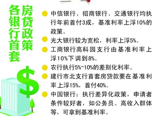 ????記者了解到,島城中信銀行、招商銀行、交通銀行均執(zhí)行年前首付3成,基準利率上浮10% 的政策。光大銀行較為寬松,利率上浮5%。民生銀行青島分行營業(yè)部工作人員直接告訴記者,現(xiàn)在貸款辦不了,在個人房屋貸款上今年沒有額度。而國有銀行中,工商銀行高科園支行由基準利率上浮10%下調(diào)到8%,農(nóng)業(yè)銀行執(zhí)行5%~10% 的差別化利率。建設(shè)銀行市北支行的工作人員告訴記者,目前首套房貸款基準利率上浮15%,首付40%。