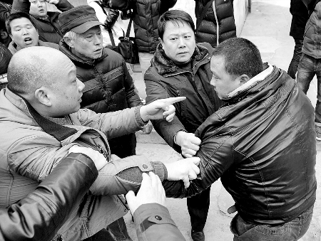 事發現場,張妙丈夫王輝(右)與藥慶衛代理律師馬延明(左)不時互有推搡。《三秦都市報》供圖