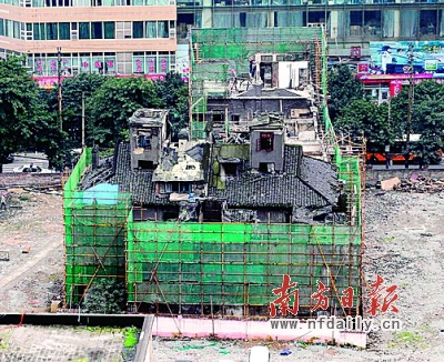 昨日下午6時,記者趕到位于重慶市渝中區解放路的行營舊址。記者看到,“重慶行營”已成施工現場,工地周圍修起了圍墻,有鐵門一扇可供進出,兩樓一底的舊址屋頂已經完全被拆掉,僅剩磚木殘體。現場有不少工人正在施工,搬運磚塊、木條。記者在施工現場圍墻上未發現有文物保護性修葺的公告。