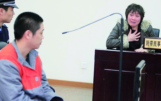死者張某的母親在法庭上痛斥被告人趙某 攝/記者曹博遠 ????22歲男子伙同兩人來到18歲女網友家中將其掐死受害者 母親法庭痛斥——你們太殘忍了還我女兒 ????為了要錢,22歲的趙某伙同梁某、付某來到女網友張某家中,將18歲的張某掐死。 ????今日上午,被控搶劫罪的趙某等3人在二中院受審,死者張某的母親要求趙某償命。 ????上午11時,趙某等3人被帶上法庭時神情輕松,見到坐在旁聽席上的家人,3人還笑著點頭示意。 可趙某還未走到被告人席上,死者張某的母親李女士突然站起身來,揮拳就打,邊打邊哭著喊:“你們太殘忍了,還我女兒,你們這些畜生!”但很快被法警制止。 “剛才不是說了要你們控制一下嗎,要不怎么開庭?!狈ü賱裾f李女士。“一看到他們,我就控制不住?!痹诶钆勘WC遵守法庭紀律后,法官宣布開庭。 2011年5月27日10時許,趙某伙同梁某、付某來到豐臺區張某家中,采用扼壓頸部、悶堵口鼻的方法,致18歲的張某死亡。 待張某母親李女士進入該房間后,趙某等3人對其持刀相威脅,搶得現金7000余元、銀行卡5張及移動電話3部等物品,并將李女士打成輕傷。 據李女士講,平時她都是中午才回家,事發當天,她剛剛打開家門,就被3個人按倒在地,“他們把我綁到臥室,管我要錢,我說沒錢,他們就打我、掐我,說不給錢就打死我?!崩钆靠拗f不下去了,稍微平靜后,李女士說她一直都不知道女兒已經被掐死了,“我女兒死得好慘,我就是要他們償命”。 “梁某說他父親病了,要錢看病,我也欠人錢,所以就商量著弄點錢花?!壁w某說,5月中旬,梁某跟他商量弄錢一起干票大的,本來說好要搶一個姓芮的男子,綁了后向他家里要錢,如果不給,就殺了芮某。沒想到芮某沒有來。 事發前,他們買了手銬、帽子和眼鏡,還從梁某家里拿了把刀。 截止發稿時庭審仍在進行中。 |