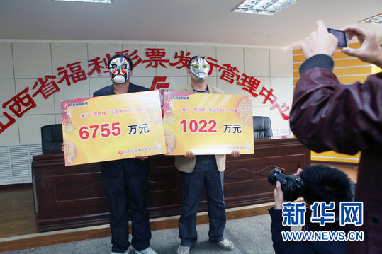 2011年10月21日,山西省福利彩票發(fā)行管理中心,兩名戴著“奧特曼”和“大花臉”面具的中獎者分別領走了1022萬和6755萬元的超級巨獎。其中一位是山西晉城彩民,中得1注1022萬元獎金。另一位是山西臨汾市的一位彩民花24元投注一張12倍的雙色球單式彩票,一舉中得12注一等獎,單注一等獎獎金562.9502萬元,12注總計獲巨獎6755多萬元,創(chuàng)造山西省彩票史上最高中獎紀錄。