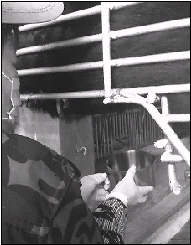 ????此時(shí),一男一女兩名工作人員不聲不響地帶著一套“取膽”工具站到了門口,在打開鐵籠和黑熊睡覺的鐵棚之間的閘口后,一頭黑熊自己鉆進(jìn)了鐵籠中,凄厲地嚎叫起來。叫上幾秒后,工作人員將鐵盒內(nèi)盛放的食物放了進(jìn)去,黑熊立即安靜了,貪婪地吞食起來。