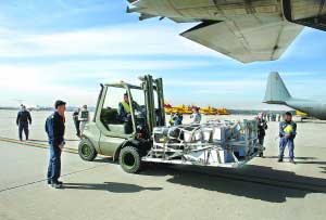 2月25日,在西班牙馬德里托雷洪空軍基地,工作人員從C-130型“大力神”運輸機上卸下部分財寶。照片均為新華社發