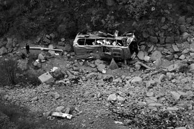 9時25分,該車剛超過一輛普桑小轎車后,在下坡時的一個急拐彎處撞飛了路邊的防撞墩,翻下深溝。此時,他們已經往回返了2.5公里。公路測速系統保留著該車的最后一個數據是在9時左右,時速為37.04公里。