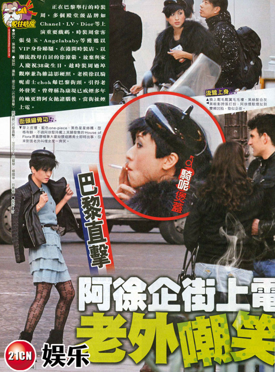 據香港媒體報道,世界幾大頂級奢侈服裝品牌上演重要戲碼,時裝周常客張曼玉、Angelababy等獲邀以VIP身份看秀。在香港開服裝店、以潮流教母自居的徐濠縈,放棄與家人慶祝38歲歲生日,趁時裝周出過觀摩兼為雜志拍硬照。老模徐濠縈以夸張造型潮爆巴黎街頭,神似站街妓女,引得老外發笑。曾聲稱為康緹戒煙多年的她更將女兒拋到腦后,當街吸煙。