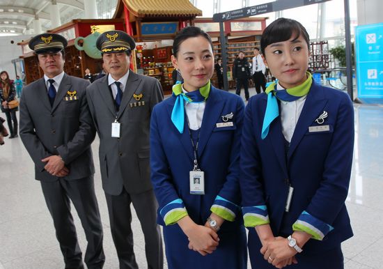 青島至釜山航線機組人員。右邊兩位是韓國空姐。