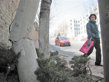 路口電線桿底部整體斷裂,只靠著幾根鐵條和頂部的線纜支撐,看上去搖搖欲墜。這讓家住鎮江南路的市民每次路過時都提心吊膽,多次向有關部門反映但事情一直沒有得到解決。 記者聞訊趕到鎮江南路7號附近看到,這條底部斷裂的電線桿整體向北傾斜,斷裂處只有幾根鐵條在苦苦支撐,電線桿頂部搭在幾根線纜上,線纜因此繃得很緊,路過的行人看到后都會遠離此處行走。“平常我都繞著這個地方走,太嚇人了,不知道什么時候就倒了,別說是砸到人身上,就是砸到車都很要命啊。”居民劉大媽說,電線桿是半年前被一輛大貨車撞斷的,之后就一直沒有修理。 記者聯系了電力部門,工作人員稱這根電線桿不屬于電力公司管理,桿頂部的銘牌上寫有“96566”。記者隨后撥打96566聯系到青島有線客服。“我們之前用過這根電線桿,但這根電線桿被撞斷后我們就將線纜都移到了其他電線桿上。”有線工作人員李師傅表示,這根桿的所有權并不歸他們。 “都不管,難道非要出了事才有人管嗎?”望著這根無人認領的電線桿,劉大媽無奈之余希望能夠引起有關部門的重視。(記者 王曉先 攝影報道) |