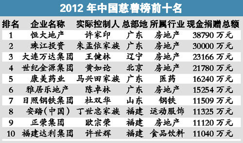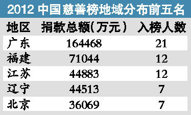 記者從福布斯中文網了解到,福布斯正式發布最新中國慈善榜。榜單顯示,捐贈過億元的企業家有13位,其捐贈總額占總金額的46%,而去年的榜單上捐贈過億元的企業家有16位;100位上榜企業家(企業)現金捐贈總額為47.9億元,同比下降41%。 前20名一半是地產大亨 榜單顯示,2011年捐贈過億元的企業家達13位。在前20名中,主要從事房地產的企業達到10家,占到一半。福布斯表示,目前,民政部尚未發布“2011年民政事業發展統計報告”,但根據其發布的2011年1~4季度全國民政事業統計累加,2011年的社會捐款總數為145.2億元,僅為2010年的37%。 今年上榜的100位企業家中,有47位同樣也是2011年中國富豪榜的上榜富豪。而從地域上看,廣東富豪們最為慷慨。 廣東富豪捐款16.4億元 數據顯示,廣東、福建、江蘇、遼寧、北京是入榜人數最多的5個地區,其上榜人數占到總數的59%,捐款總額占總捐款額的75%,是主力捐款地區。其中,廣東有21名富豪入榜,捐款總額為16.4億元。 從捐款方向上看,目前捐款主要流向教育、扶貧、創業等領域。粗略統計,約有80%的捐款流向各類慈善機構,但基于中國慈善機構的信用去年遭到重創,企業家們更喜歡成立自己的基金會,或在大型基金會、慈善會內部成立自己的基金。 福布斯正式發布最新中國慈善榜,100位上榜企業家(企業)現金捐贈總額同比下降四成多。但前20名中,有一半為地產大亨,其中,廣東表現最為積極。 |