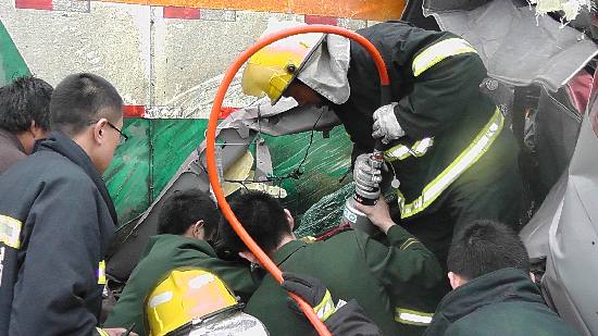 救援現場 利用液莊鉗進行破拆 青島新聞網4月12日訊 10日凌晨,位于正陽西路與李王路十字路口處發生一起交通事故,一輛裝滿路邊石的貨車與滿載30噸的原油罐車交叉發生撞擊,貨車駕駛室嚴重變形,司機被困于駕駛室內,城陽區公安消防大隊接警后立即實施救援,歷時5小時成功將人救出。記者從醫院獲悉,傷者腹部、腿部多處受傷,幸無生命危險。 4月10日凌晨3時38分,城陽區公安消防大隊接到報警稱:位于正陽西路與李王路十字路口處發生一起交通事故,有兩輛貨車相撞,其中一輛裝有原油,1人被困,請求火速前往救援。接到報警后,消防救援官兵迅速趕往事發現場。 4點03分,消防救援官兵到達現場后,發現兩車交叉相撞,車禍現場一片狼籍,滿地都是凌亂的大石塊和汽車散落的零部件,現場指揮員立即上前了解情況,現場為一輛裝滿路邊石的貨車與滿載30噸的原油罐車交叉發生撞擊,載有路邊石的貨車駕駛室嚴重變形,一名中年男子被困于駕駛室內無法動彈,兩條腿被變形的車頭死死的咬住無法動彈,被困者表情痛苦,如果不及時營救隨時都有生命危險,貨車嚴重損毀,駕駛艙深度凹陷。 |