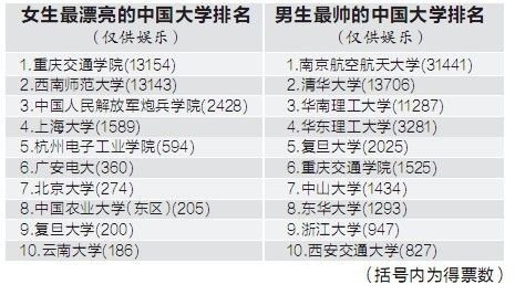 網(wǎng)評“男生最帥”大學(xué) 南航排名第一 ????最近,網(wǎng)上關(guān)于“女生最漂亮的中國大學(xué)”和“男生最帥的中國大學(xué)”的排名引起網(wǎng)友圍觀。其中,南京航空航天大學(xué)以3萬多票的絕對優(yōu)勢喜登“男生最帥的中國大學(xué)”第一名。聽說這個消息,不少南航男生樂了,“頓時覺得自己帥了起來”,也有一些自覺外貌在“平均水平線”以下的南航男生則害羞地表示,“不好意思,拖了母校后腿?!?/p> ????還有南航女生欣慰地表示,“原來一直不知道,我居然呆在男生最帥的學(xué)校,真幸福?!?/p> ????不過,在“女生最漂亮的中國大學(xué)”前十名中,沒有一所江蘇的大學(xué)“入圍”,這樣的情況,讓不少江蘇高校的女生有些不服,“自古以來,就是江南水鄉(xiāng)出美女嘛?!?記者 王穎菲) ????附錄: ????女生最漂亮的中國大學(xué)排名(僅供娛樂) ????1.重慶交通學(xué)院(13154) ????2.西南師范大學(xué)(13143) ????3.中國人民解放軍炮兵學(xué)院(2428) ????4.上海大學(xué)(1589) ????5.杭州電子工業(yè)學(xué)院(594) ????6.廣安電大(360) ????7.北京大學(xué)(274) ????8.中國農(nóng)業(yè)大學(xué)(3281) ????5.復(fù)旦大學(xué)(2025) ????6.重慶交通學(xué)院(1525) |