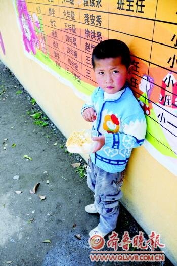 一個小朋友獨自站在墻邊吃飯。 臺兒莊區(qū)澗頭集鎮(zhèn)高山后小學(xué)地段偏僻,學(xué)校總?cè)藬?shù)500多人,學(xué)校沒有食堂,有300多名學(xué)生要等著家長來送飯,炒土豆絲拌米飯就是大部分學(xué)生的午餐。 奶奶,把剩的油條帶來 23日中午11時55分,臺兒莊區(qū)澗頭集鎮(zhèn)高山后小學(xué)門口堵滿了送飯的學(xué)生家長。“孩 “孩子的母親幾年前就離家出走了,孩子的爸爸在外地打工。”談到孫子,趙福芝顯得非常無奈。她說,孫子叫楊宏偉,在讀二年級,今年正好6歲。正說話間,學(xué)校下課,聽話的楊宏偉急匆匆地跑到奶奶身邊。“奶奶,我昨晚讓你帶來的油條你帶來了嗎?”說著,楊宏偉伸出手開始翻找食物。“這幾根油條是我前幾天趕集的時候買的,剩下2根沒吃完,昨天晚上他就一直叮囑我,午飯時一定給他帶過來。”看著孫子滿足的樣子,趙福芝嘆了一口氣。 “每天放學(xué)的時候都會有很多學(xué)生在學(xué)校門口等著家人,最讓我難忘和心痛是,上一次我有點事來晚了,沒想到我們家孩子沿著路往回走,在路上餓得哇哇大哭,我的心當時就碎了。”說到動情處,來自演武莊的學(xué)生家長李正英眼眶發(fā)紅。 媽媽給我1塊錢買飯 中午12時9分,在一年級2班靠窗的位置,一個面黃肌瘦的小女孩獨自坐在座位上,手里端著一個盒飯,盒飯里有一些土豆絲和米飯,看上去幾乎沒有油花。小姑娘偶爾抬起頭看看正在吃飯的同學(xué),用筷子夾幾個米粒塞到嘴里。“我媽媽很忙,平常沒時間來給我送午飯,早晨就塞給我1元錢,讓我買盒飯吃。”和記者聊天時,她瞪著大眼睛,顯得有些緊張。這時站在旁邊的政教處主任李麗告訴記者:“她叫王彩虹,每天中午吃飯她都是自己出去買一份盒飯回來吃,很少見到她媽媽過來。盒飯也很單一,經(jīng)常是土豆絲拌米飯。” 三年級的一名男同學(xué)手里拿著煎餅,匆忙吃幾口,看樣子是太著急噎著了,于是匆匆跑到水龍頭,打開水龍頭喝了幾口涼水,喝完之后就和同學(xué)打鬧著跑開了。“有時候我就發(fā)現(xiàn),有些學(xué)生水杯都沒有,基本喝不上熱水,吃飯的時候在外面一邊玩一邊吃,渴了就去水管喝涼水。” 有的學(xué)生則跑到校門口小賣部買飲料喝,這些飲料外包裝看上去非常舊,大部分飲料竟然沒有標注生產(chǎn)廠家和地址。 每天步行15里給孫子送飯 家住演武莊70多歲的李老太每天都要步行近15里路來給孫子送飯,她用保溫杯帶水,一半給孫子洗手,一半留給孫子喝。“孩子父母都在外地打工,孩子留給了我。平常家里太忙脫不開身,眼看著表知道快要放學(xué)了,就急匆匆地趕到學(xué)校給孩子送飯,孩子現(xiàn)在正在長身體,我們盡量給做點好點的伙食,但是最好的飯食基本上都是米湯加青菜。孩子在讀二年級,我也不能虧了孩子啊。”李老太無奈地說。 “中午孩子大體上吃點,其實根本就吃不好也吃不飽,我們家孩子每天下午放學(xué)回家的第一件事就是放下書包,找吃的。想想孩子真的是太可憐了,他也經(jīng)常跟我說,有時候上課的時候都突然感覺餓得慌。”8歲的王浩然正在低頭吃煎餅和辣椒白菜,母親魏賢霞一邊愛憐的看著兒子,一邊讓孩子慢點吃,趕忙給端來一碗小米湯。 希望得到幫扶讓孩子們吃好點 “學(xué)校要是有個食堂就好了,那樣的話算是幫孩子家長圓了個心愿,我們都盼著呢。”三年級學(xué)生王雨的母親李正英告訴記者。采訪中,很多家長也盼望著有一天學(xué)校也有屬于自己的食堂。 “我們學(xué)校自2008年建校之后,就沒有規(guī)劃食堂,主要是資金不足。我們雖然多方籌集也未能如愿,現(xiàn)在我們也正在想辦法,等到有了學(xué)校食堂,孩子們就會慢慢好起來了。”談到未來,高山后小學(xué)的徐校長既無奈又充滿期待。 徐校長表示,由于高山后村面積相對較大,所以學(xué)校就建在這個位置,周圍的村子還包括演武莊、耿樓村等幾個村莊。“除高山后村外,離學(xué)校近的村莊少說有8里路,遠點的村莊就達到20多里路。每天中午放學(xué)之后大約有100多人需要回家吃飯,剩下的300多人都需要在學(xué)校吃,我們也在積極地同各種公益組織聯(lián)系,希望能夠得到相關(guān)的幫扶,讓這些孩子吃好點。” |