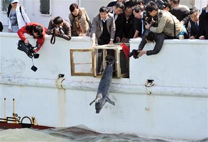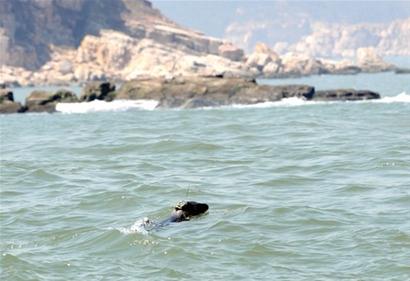 青島家養海豹蓬萊放生 馴養員落淚 青島家養海豹蓬萊放生 馴養員落淚 昨日,“海納”和“渤躍”姊妹倆頭戴衛星信號發射器,乘船從黃海與渤海交界處的長島“海豹礁”附近入水,重返大海。據介紹,青島水族館人工繁殖海豹野化放養,在省內屬首次。負責監控海豹動向的遼寧海洋水產科學院昨晚已經與美國科研單位取得聯系,接收到的海豹衛星信號正在做進一步分析。 送行,青島海水洗澡