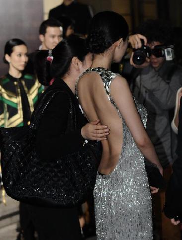 2012年04月26日,上海,近日楊冪出席某活動離開會場。站在門口狂露玉背擺POSE,任由嘉賓拍照,令人大呼其身材前凸后翹。現場甚至有女嘉賓伸手摸著楊冪的玉背拍合影,使其顯得頗為尷尬。