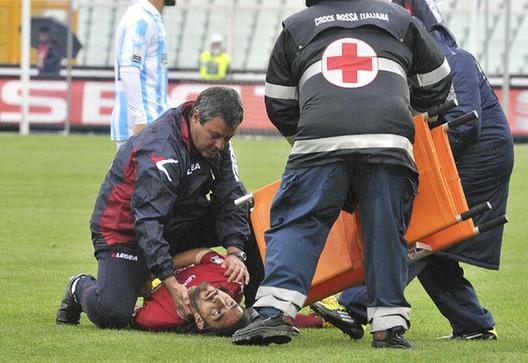 4月14日,利沃諾球員莫羅斯尼(下)在接受醫生救治。當日,在意乙聯賽利沃諾隊客場與佩斯卡拉隊的比賽進行至第31分鐘時,利沃諾球員莫羅斯尼因心臟病突發而猝死,原定于當日進行的意甲和意乙聯賽全部暫停。新華社/路透