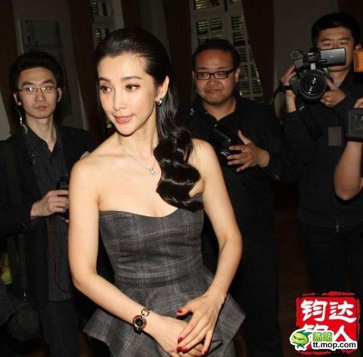 活動現場,李冰冰身穿灰黑色條紋露肩短裙,大秀香肩美背,性感之余,又不失端莊,典雅。非常奪人眼球。