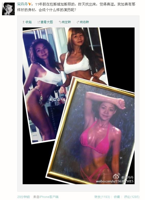 ????5月4日上午8點,宋丹丹在其微博曬出11年前比基尼舊照,其中一張,她身著桃紅色比基尼,性感嫵媚,引網友“膜拜”。宋丹丹感嘆道,“11年前在拉斯維加斯照的,昨天找出來,覺得真逗。我如真有那樣好的身材,會成個什么樣的演員呢?”