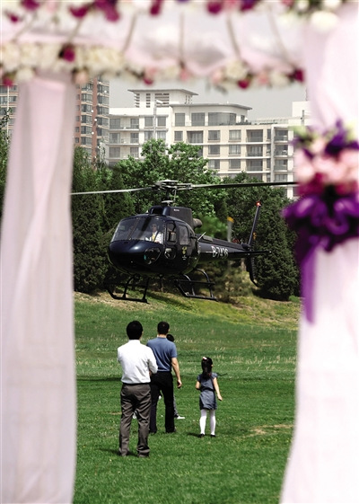 昨日,朝陽區一公館,直升機降落,賓客們紛紛上前迎接新人。 伴隨著巨大的轟鳴聲,一架直升機落在草地上,頓時吹起漫天的蒲公英。隨后,在眾親友的祝福中,一對新人走下飛機。 昨日上午,京城首次直升機迎親在東四環某公館內上演,為這一新興的航空業務拉開序幕。據了解,該次飛行花費5萬元,由專業航空公司提供服務。 遇臨時航空管制改路線 “草地有架飛機!”昨日上午9時許,東四環某公館內,三四名孩子拽著父母的手,走向一架黑色直升機周圍,來回打量著。期間,有的孩子忍不住好奇,或摸摸機身,或爬上駕駛座旁,擺出POSE拍照。 附近,多名首航直升機通航航空服務公司工作人員站在滅火器等器材旁,不時提醒孩子們注意安全。據他們介紹,該飛機為歐洲直升機公司系列,機型為AS350B3,俗稱“小松鼠”,其機艙有6個座位,除兩個駕駛座外,后面可載4人。 距離直升機百米外,一個婚禮的現場已布置完畢,賓客們簽到寒暄。 據介紹,該飛機原計劃將新人從附近接來,并在公館逗留片刻后再飛往西北方的鳥巢。在上空盤旋一段時間后,飛機帶著新人原路線返回。“行程約30公里,耗時控制在30分鐘內,距離地面約200米。”工作人員說。 讓人意外的是,計劃出現了變數。 在起飛前向民航局報備飛行計劃時,首航公司接到通知,當日12時前臨時有低空飛行管制,因此婚禮航線的原方案被迫改變。 為不讓新人失望,現場工作人員啟動備用方案,臨時將起飛時間推遲30分鐘,帶新人先繞公館數周,等到婚禮儀式結束,飛行管制取消,再按照原計劃飛往鳥巢。 據了解,下午2時,直升機載著一對新人,飛往鳥巢,而后抵達八達嶺。 多樣化業務需提前審批 上午10時30分許,在指揮員指示下,直升機載著新人和攝像師,從附近清空的停車場起飛,圍觀者均被螺旋槳刮起的大風逼得睜不開眼。 隨后,該飛機向東前行至東四環輔路上空,先后來回公館之間三次,方緩緩降落在草地上。待機艙門打開后,新郎緊緊拉著新娘的手,出現在賓客們面前接受祝福,同時揮手感謝。最終,眾人洋溢著笑容,合影留念。 “今天是(北京)首次用來迎親。”首航工作人員說,此前,該公司在這家公館的草坪上成功為一位俄羅斯要人送行,隨即雙方繼續合作,推出婚禮接親業務。近期,該公司接到第一單生意后,于一周前開始向軍方、民航局、首都機場、通州機場等相關部門進行飛行計劃申請審批,大約三天即通過了審核。按照規定,在正式飛行當天還需再報備。 “由于是第一次,我們給這對新人打了折扣。”該工作人員說,具體收費是按照1小時3萬元計算,新人訂購了1小時的行程,本次飛行加上申報審批等費用,共計5萬元。 - 資料 “小松鼠”直升機 最大起飛重量2250公斤、有效載荷1022公斤、最大速度287公里/小時、最大巡航速度258公里/小時、最大航程665千米。應用范圍包括醫療救助、搜救、空中執法、石油平臺支持、公務用途、電力巡線、護林防火、旅客運輸、航拍飛行等。 |