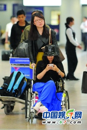 近日何潔證實她到日本慶生時,不慎把腿摔骨折了,只得暫停演藝活動。日前某天晚上,記者獲悉何潔回京的消息,當晚十一點左右記者看到何潔的助理推著輪椅出現在出閘口,輪椅上坐著一個身穿寶藍色長裙的年輕女孩,記者馬上認出她就是有傷在身的何潔。何潔戴著墨鏡,頭上罩著一頂黑色女式圓帽,雖是“病人”但打扮仍然不失“潮味”,記者注意到她的傷腳上穿著一只帶有卡通造型的拖鞋。