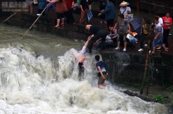 5月12日下午,一位武漢65歲游客游覽鳳凰古城時不慎掉入沱江。連日來的暴雨使沱江河水上漲,水流湍急。危急時刻,一名游客和一名當(dāng)?shù)氐貙?dǎo)游跳入洪水中,將老人推上岸。老人獲救后,兩名施救者因力氣耗盡被困在洪水中,隨時都會被沖到下游。最終,在巡邏民警、餐館服務(wù)人員、游客等眾人的努力下,兩人獲救。圖片來自網(wǎng)絡(luò)